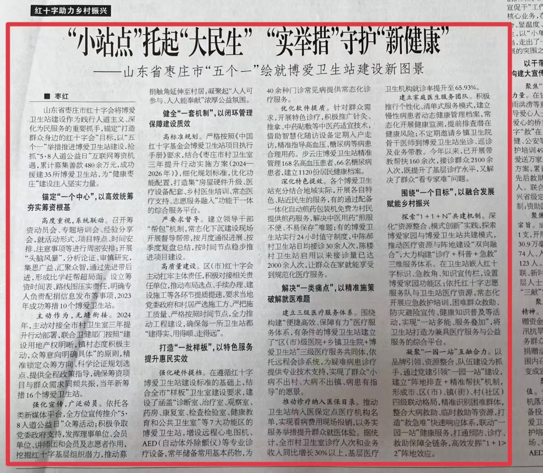 山东枣庄市红十字会将博爱卫生站建设作为践行人道主义、深化为民服务的重要抓手,锚定“打造群众身边的红十字会”目标,以“五个一”举措推进博爱卫生站建设,抢抓“5·8人道公益日”互联网筹资机遇,累计募集善款480余万元,成功援建35所博爱卫生站,用人道成效绘就了保障民生的红十字篇章,让“救在身边”温暖可及,为“健康枣庄”建设注入坚实力量。