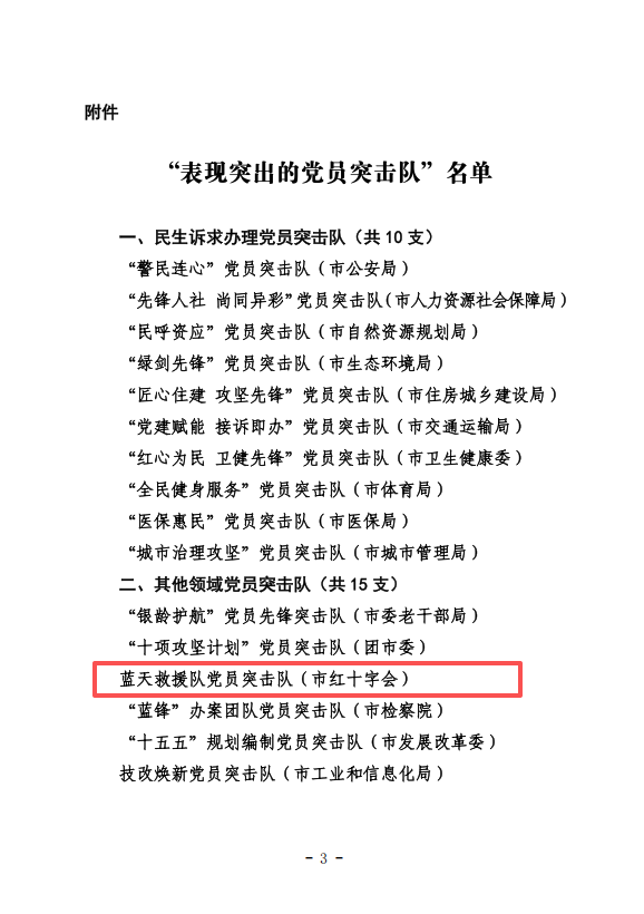 近日,市委市直机关工委表扬了一批“表现突出的党员突击队”,市红十字蓝天救援队党员突击队获此殊荣!