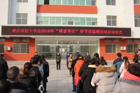 1月19日下午,枣庄市红十字会2016年“博爱枣庄”春节送温暖活动启动仪式在台儿庄区职业中专举行,全市红十字会系统2016年春节送温暖活动全面启动。市红十字会常务副会长杨娜、副会长郑洪玲,台儿庄区委常委、副区长李晓红,台儿庄区教育局局长樊兴举、区职业中专校长邱志干等领导出席启动仪式。启动仪式由市红十字会副会长郑洪玲主持。台儿庄区委组织部、台儿庄区教育局、台儿庄区红十字会负责同志,市派台儿庄区18个村的第一书记、各受助村、受助单位负责人等参加了启动仪式。