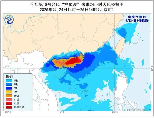 大风预报:24日14时至25日14时,巴士海峡、南海大部、西沙群岛、中沙群岛、南沙群岛、东沙群岛及黄岩岛附近海域、台湾海峡、台湾以东洋面、东海南部、北部湾、琼州海峡、福建南部沿海、广东南部地区及沿海、珠江口区、海南岛沿海、广西沿海将有6-9级大风、阵风10-11级,其中,广东中西部沿海、广西沿海和南海北部的部分海域或地区风力有10-13级、阵风14-15级,台风中心经过的附近海域或地区风力可达14-16级、阵风17级以上。