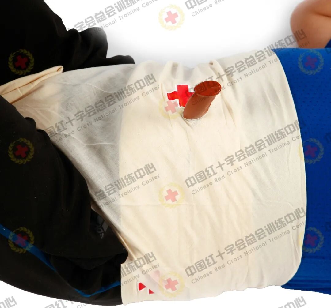 伤口表浅异物可以去除,然后用敷料包扎;如较大异物扎入机体深部,不要拔除。以匕首插入腹部为例,处理操作流程如下: